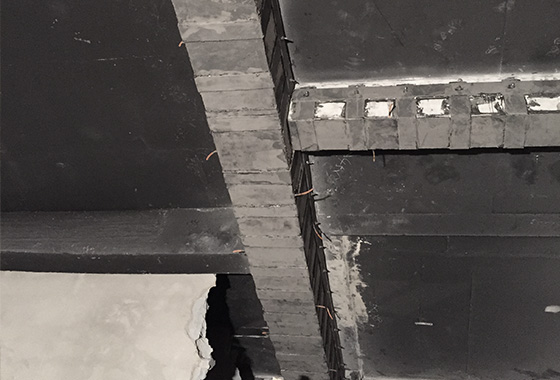 用小錘輕擊粘貼鋼板,從音響判斷粘貼效果。若錨固區(qū)有效粘結(jié)面積少于90%或非錨固區(qū)有效粘結(jié)面積少于70%,應剝離鋼板,重新粘貼。
